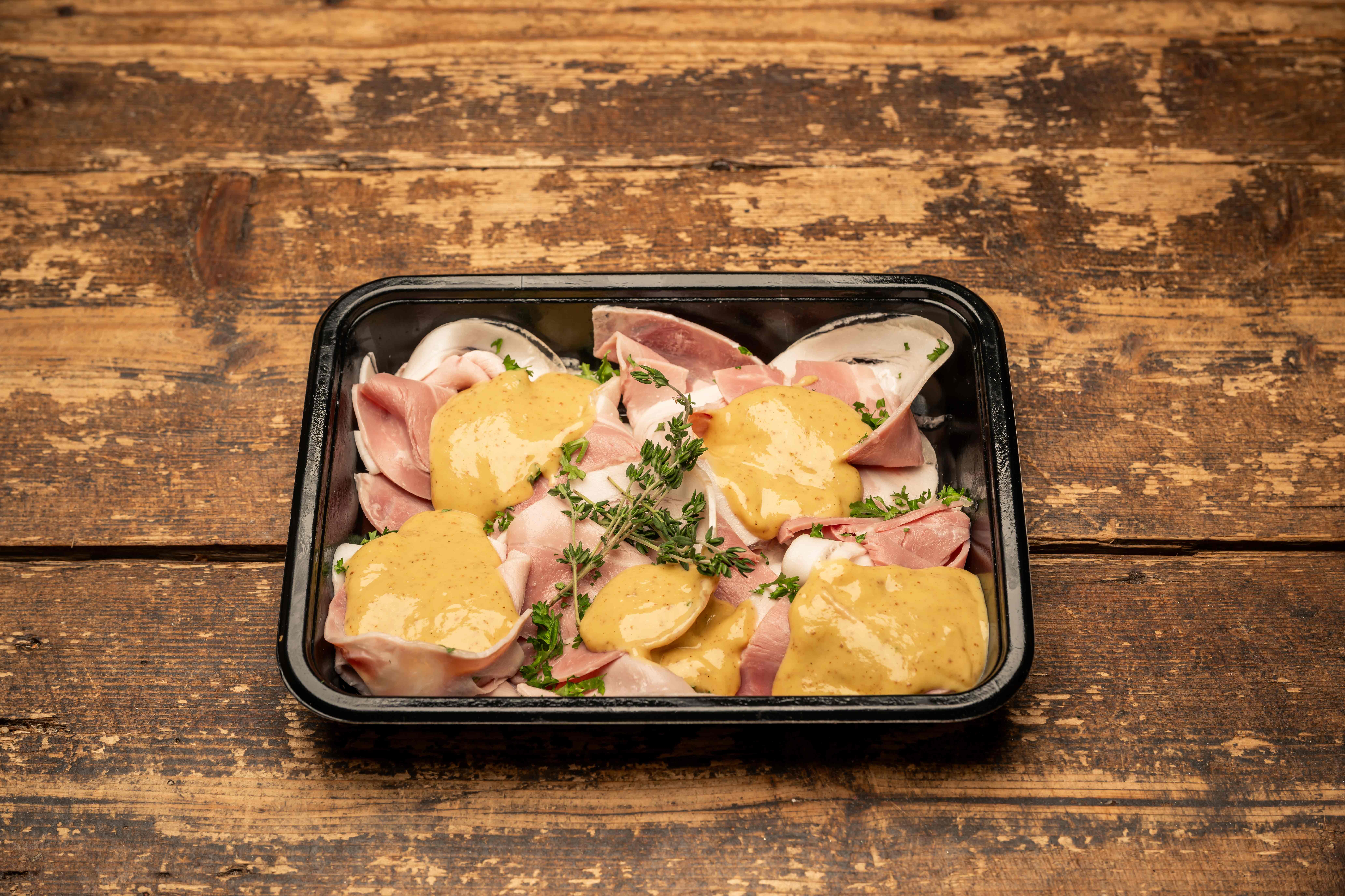 Gegrilde beenham met frisse kruiden in een zachte saus van mosterd en honing.