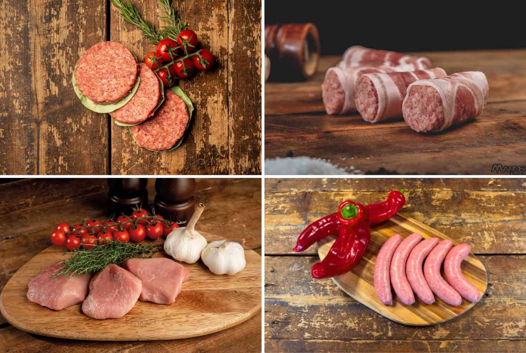4 hamburgers, 4 slavinken, 4 varkens saucijzen, 4 varkens oesters