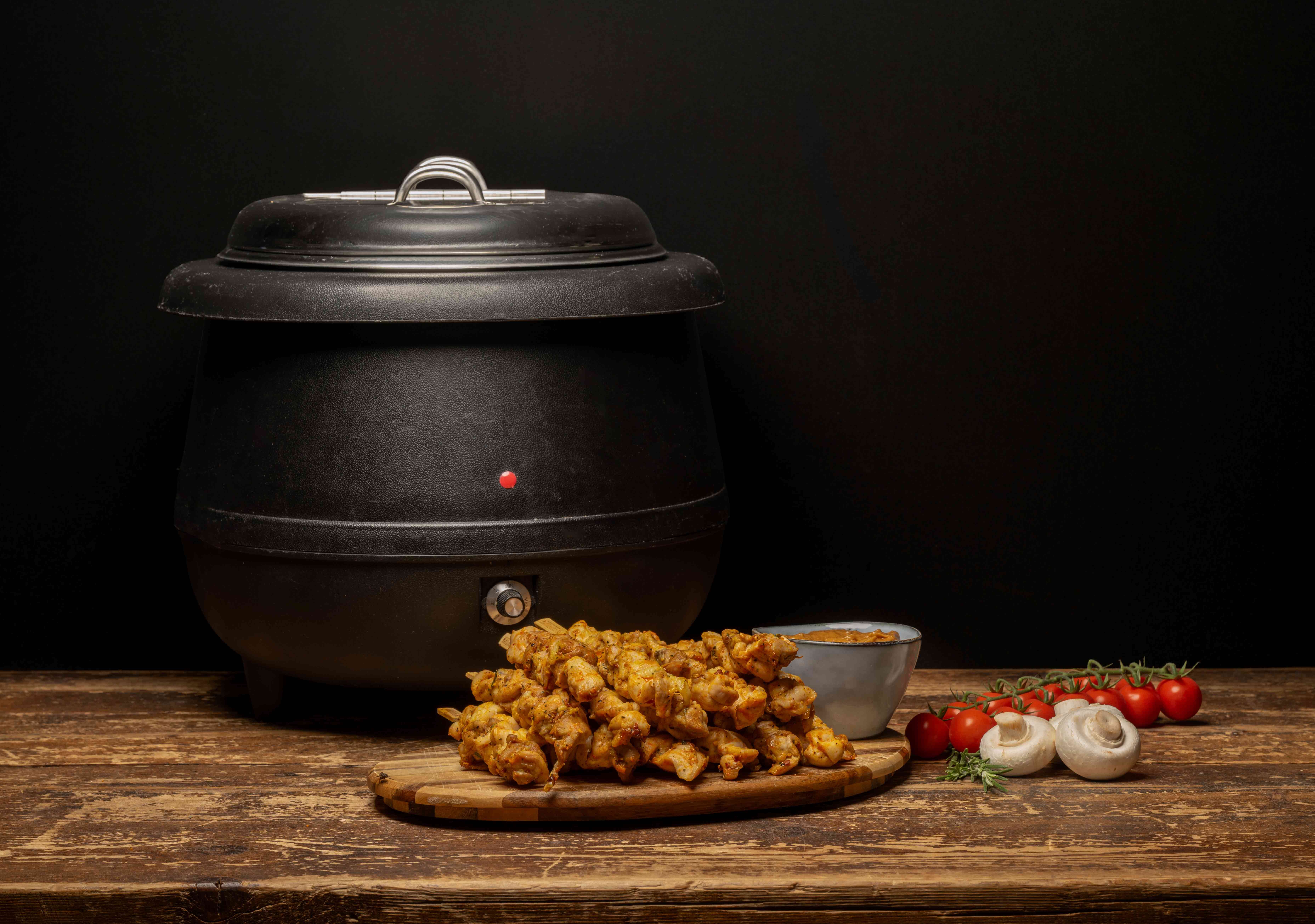 De satépan wordt koud geleverd. Het opwarmen van de satépan is heel gemakkelijk. De satéstokken kunnen in de satésaus worden verwarmd. Zet de satépan 2 uur van te voren aan. |