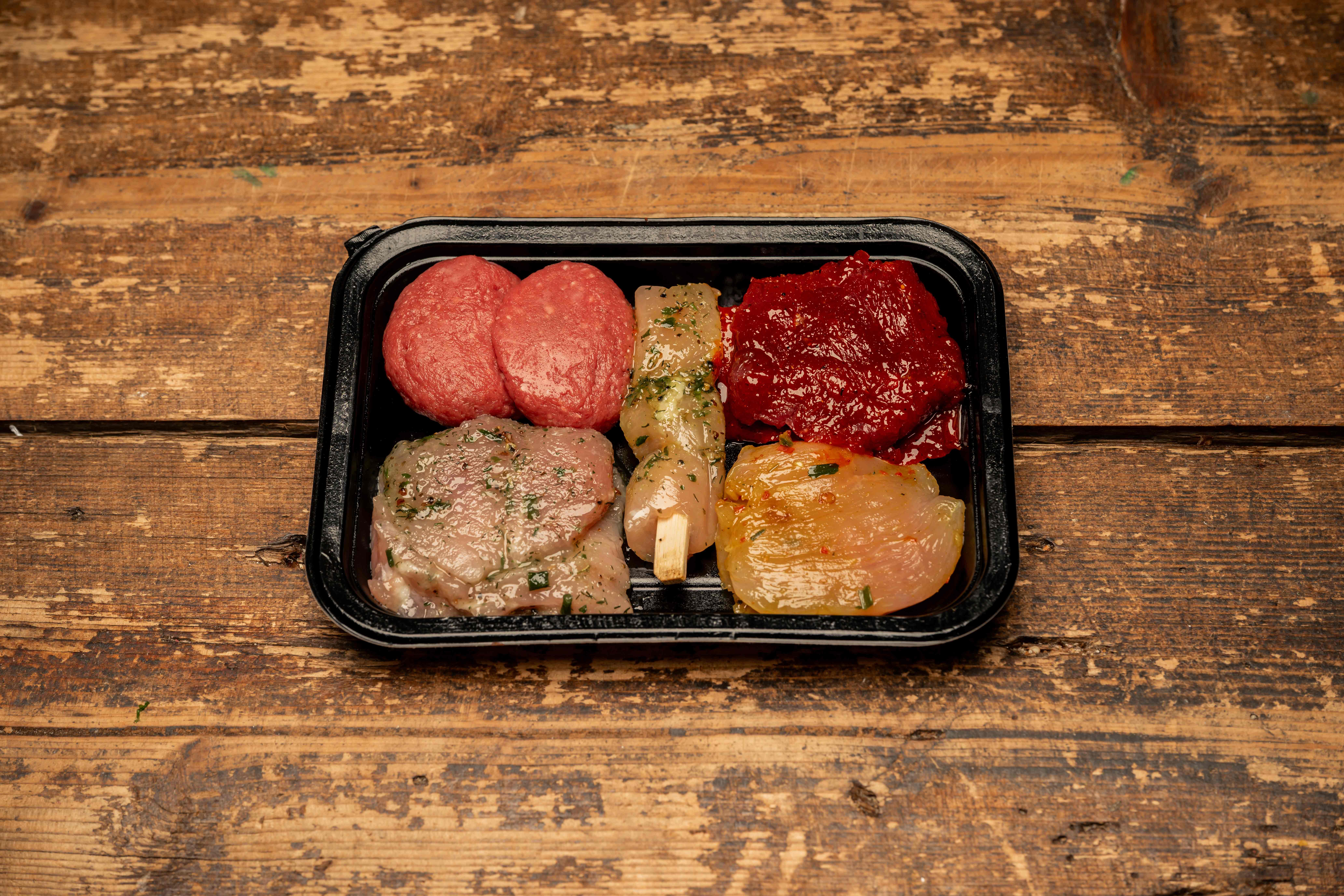 Gourmet allergeenvrij per persoon: Beefburger,kipfilet,varkensfiletlapje,biefstuk en kipstokje