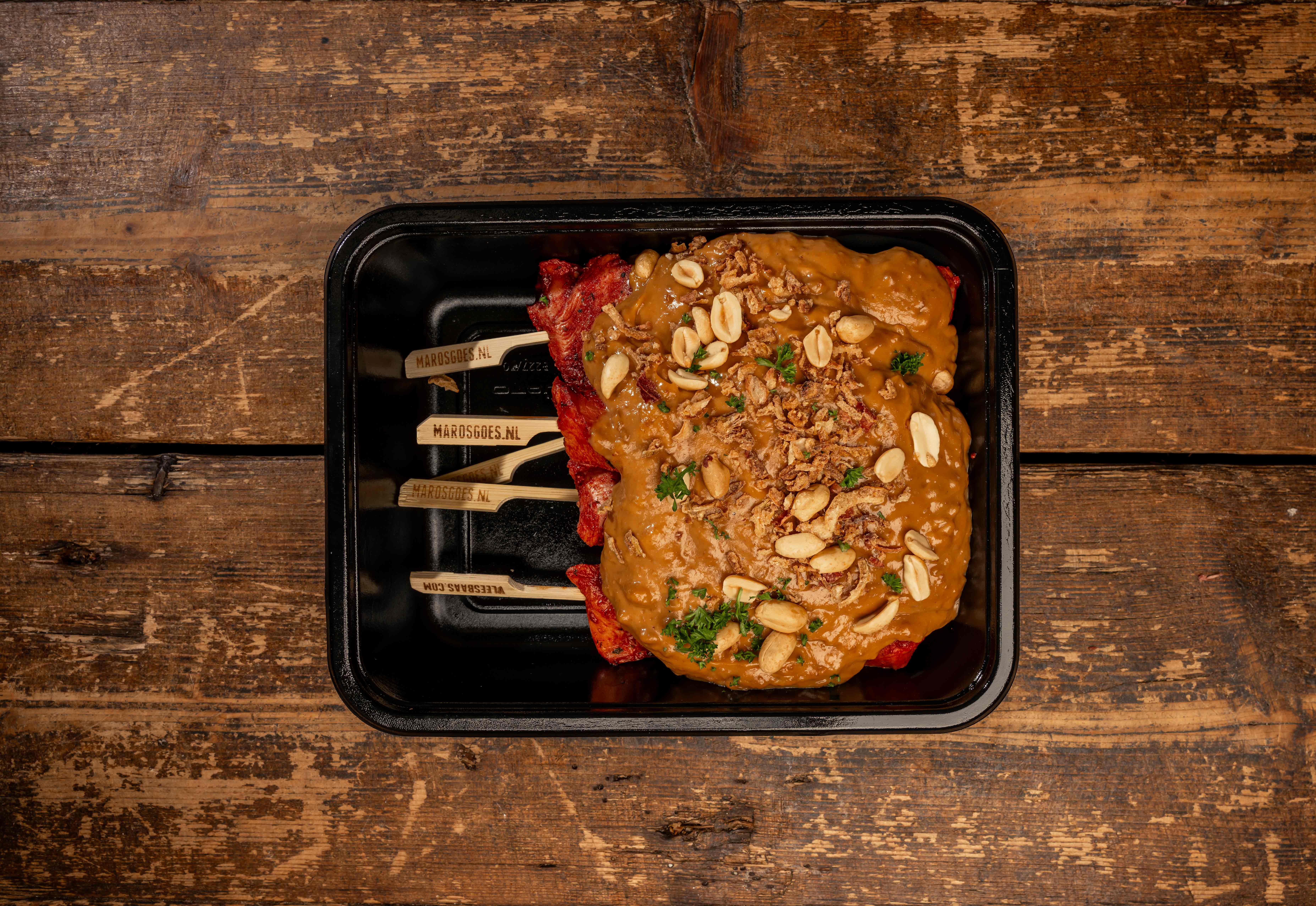 Vijf gegaarde spiezen van gemarineerde kipsaté met satésaus, pinda's en gefrituurde uitjes.