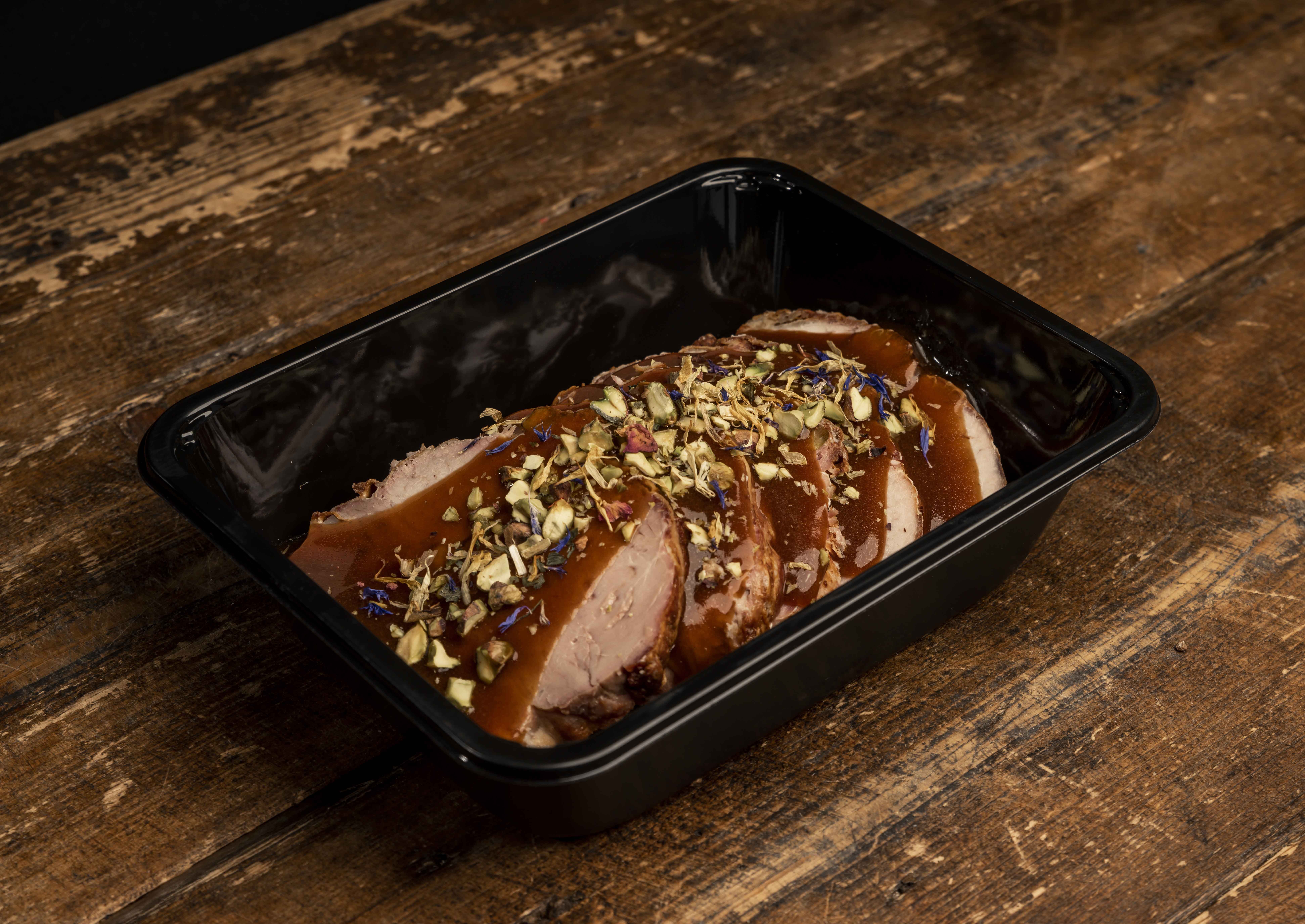 Gegaarde rollade van varkensprocureur gevuld met gekruid gehakt en omwikkeld met spek. Overgoten met een kruidige vleesjus.